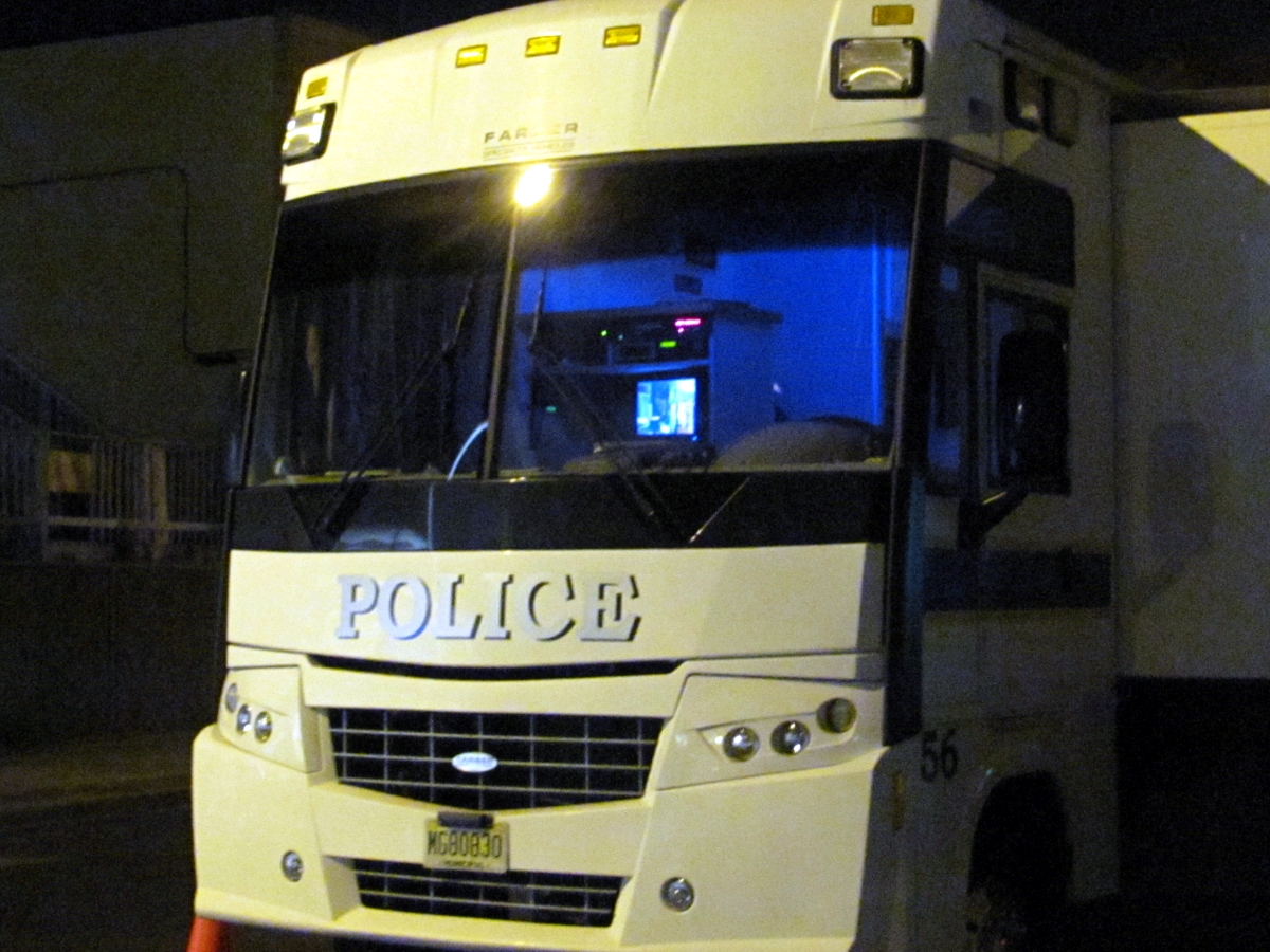 The spots light up the "Bull Durham" building which is still standing. North Avenue, Plainfield.