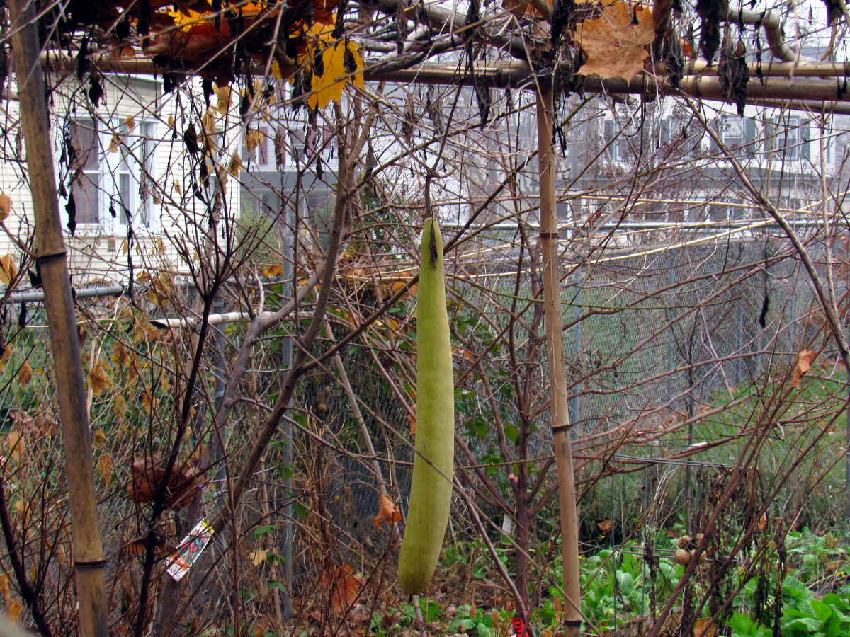 The backyard neighbor's garden still has a few large cucuzza squash growing.